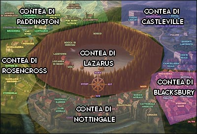 Ti invito a prendere confidenza con la mappa: conoscere la posizione delle contee e dei luoghi è essenziale per comprendere la politica di Laddington, che dipende in gran parte dalla geografia del territorio. Ogni zona ha una logica urbanistica che incide direttamente sulla narrazione e sugli equilibri tra le fazioni.